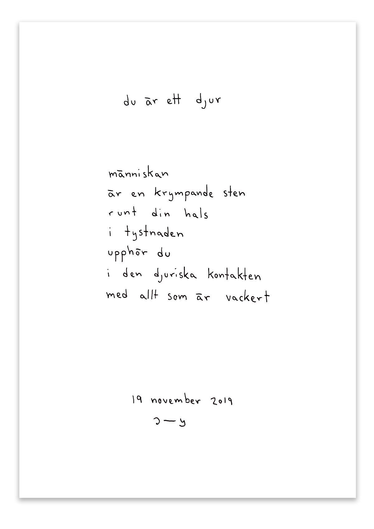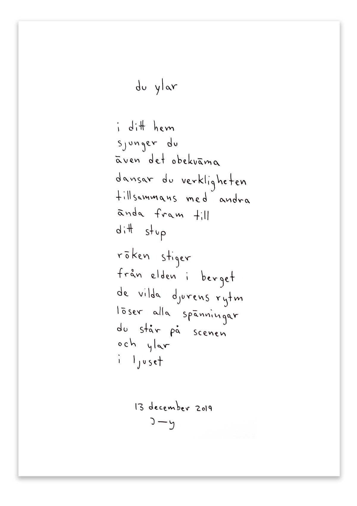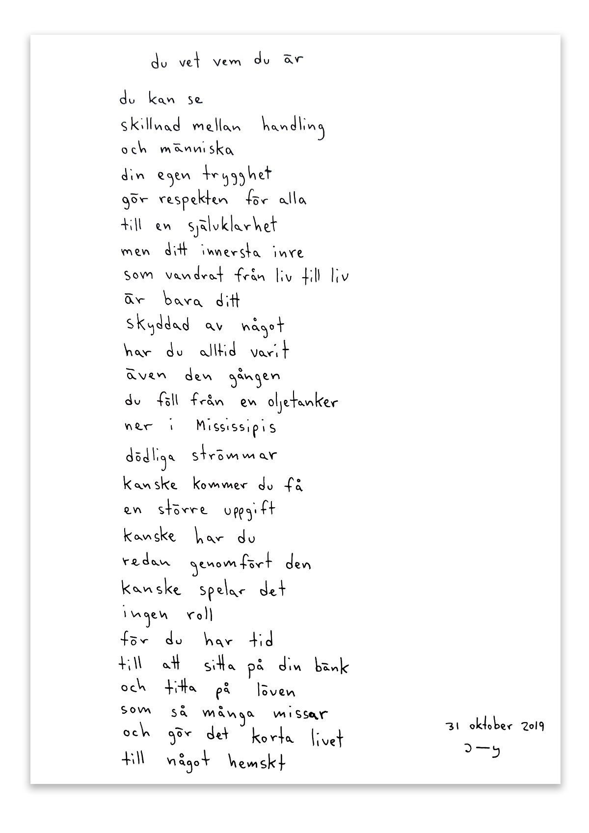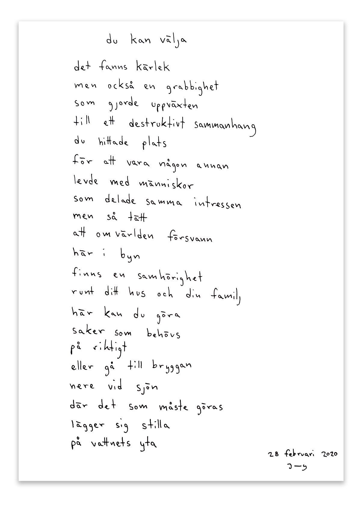 Året är 2018. Jag har återvänt till Malmö och Författarskolan efter en sommar i Uddebo. Jag vill prova att skriva en dikt om någon jag inte känner. Ända sen jag var liten har jag tyckt om att lyssna på äldre människors berättelser. Jag tar kontakt med ett äldreboende i Malmö och får kontakt med S. Hens livsberättelse börjar med en flykt under andra världskriget. Efter vårt samtal sätter jag mig i korridoren på äldreboendet och skriver hens dikt.
