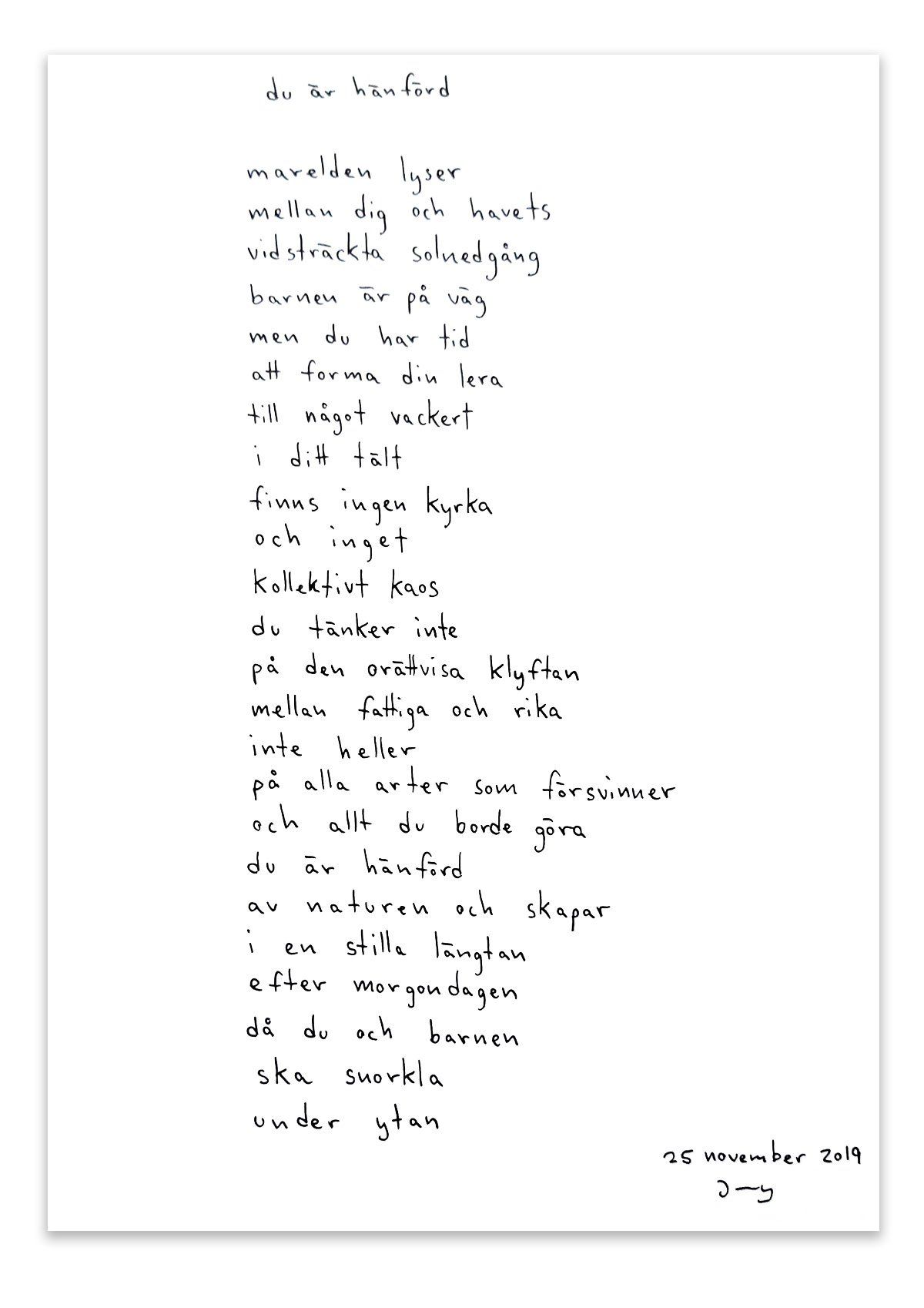 Sensommaren 2020 var två filmare på besök för att göra ett reportage om byn där jag bor. Det resulterade bland annat i att jag stod på taket till Väveriet i Uddebo och läste en dikt. Dikten jag läser skrev jag till en av mina närmaste vänner i Dikta digs begynnelse. På den tiden som mitt samtalsrum var en tältkåta i skogen.